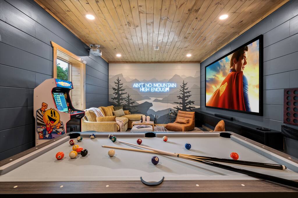 ✿ Indoor Pool ✿ Private Hot Tub ✿ Theater room with 135" projector screen ✿ Deck with dining table, gas grill, pizza oven and sectional couch ✿ 1.5 mi from Parkway ✿ 10 min from the Ripken Experience ✿ 10 miles from downtown Gatlinburg (20min drive) ✿ Parking for 2 cars ✿ Sleeps 7, up to 5 adults comfortably ✿ High Speed Internet ✿ Billiard/ ping-pong table ✿ Pac-man arcade ✿ Washer and Dryer ✿ Boardgames ( Tic Tac Toe, Checkers, Chess, Connect4, Backgammon, Scrabble, Uno, Monopoly, Cards, Jenga) ✿Baby Amenities -Graco Table2Table LX-6 in 1 Highchair -Graco Park 'n-Play Travel Dome LX-Playard | Features Portable Bassinet -Sheets included ✿ No smoking/vaping inside ACCOMMODATIONS: Bedroom 1: Queen Bed Bedroom 2: King Bed Bedroom 3: Twin Bed (Loft) Bedroom 4: Queen Bed (Pull Out in Movie room) DRIVE: NO scary steep windy roads with cliffs on the sides! CONSTRUCTION: The cabin is located in a resort community that is still growing so you may encounter construction during the work day. There may be some construction noise until surrounding cabins are completed. WILDLIFE: Our cabin is tucked away in the beautiful wilderness, so it’s normal to encounter some of our wildlife neighbors, like bears, while staying in the Smoky Mountains. Please be cautious and keep your distance—make sure your car windows are up, doors are locked, and food is safely stored (not left in your car or outside). You may also spot or hear some critters and insects during your stay. While we do our best with regular pest control treatments, you might still get a visit from anything with 0, 2, 4, 6, 8, or even 100+ legs—think millipedes, ladybugs, or even sneaky flying squirrels! To help keep them out, please close entry doors when not in use.
